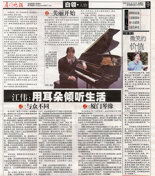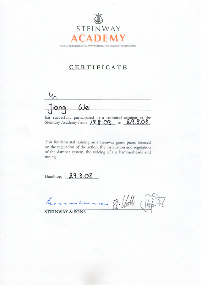 家調(diào)音,獲得廣泛的贊譽(yù),曾連續(xù)3屆擔(dān)任中國國際鋼琴比賽的專家技師?,F(xiàn)任廈門音樂家協(xié)會(huì)鋼琴調(diào)律